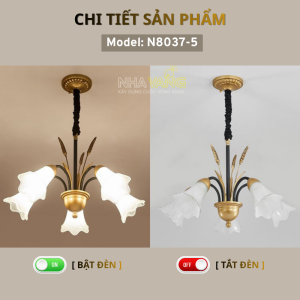 Mã đèn chùm 𝐍-𝟖𝟎𝟑𝟕/𝟓 với thiết kế hài hòa, chao được làm từ chất liệu thủy tinh nước gạo, giúp ánh sáng lan tỏa nhẹ nhàng và ấm áp. Đèn được lấy cảm hứng thiết kế từ bông lúa mì và hoa loa kèn, mang đến cảm giác mềm mại và gần gũi với thiên nhiên.