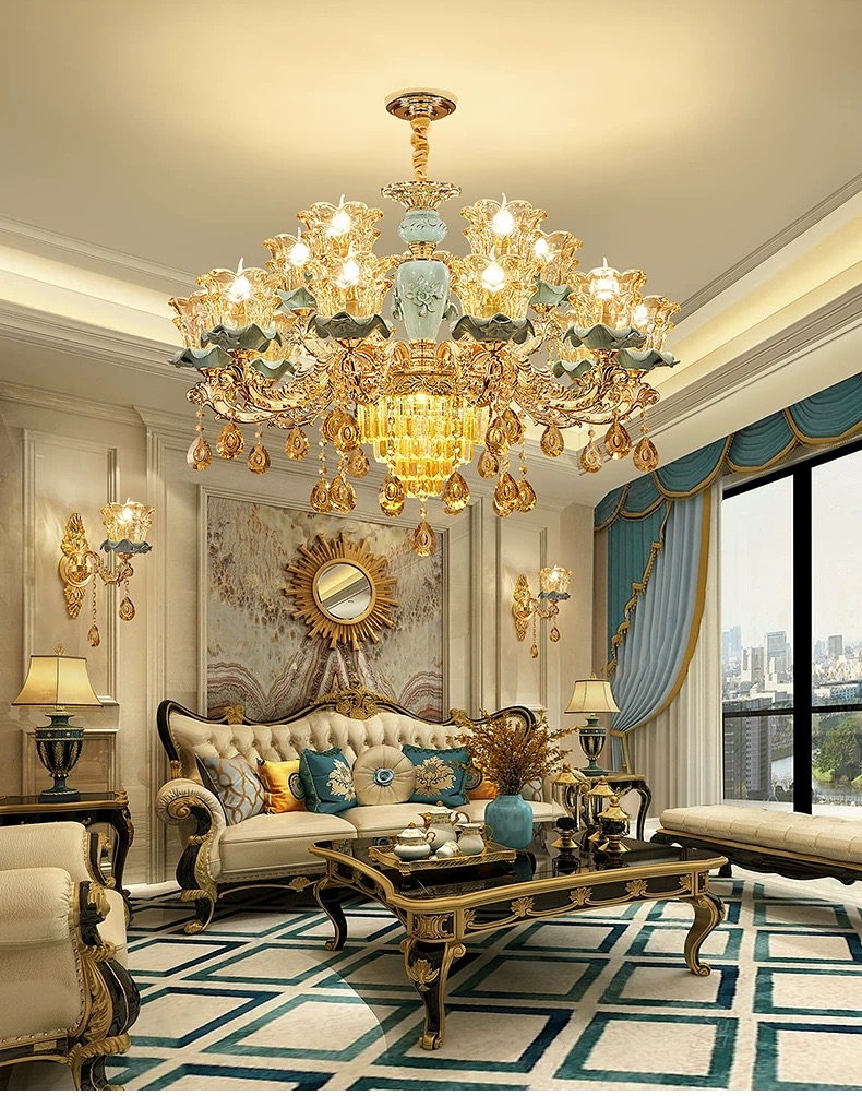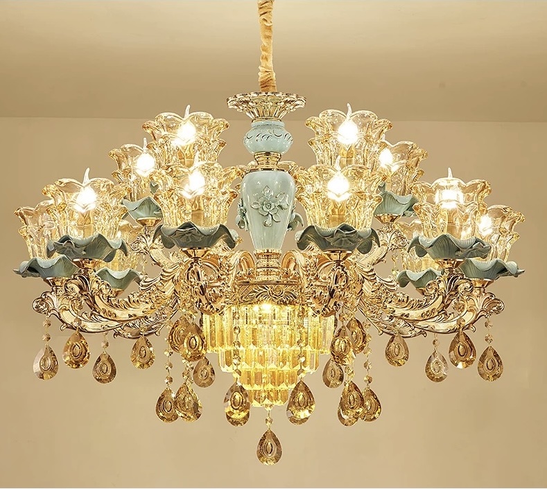 Thiết kế: ĐÈN CHÙM PHA LÊ TÂN CỔ ĐIỂN CỐC HOA 15 TAY