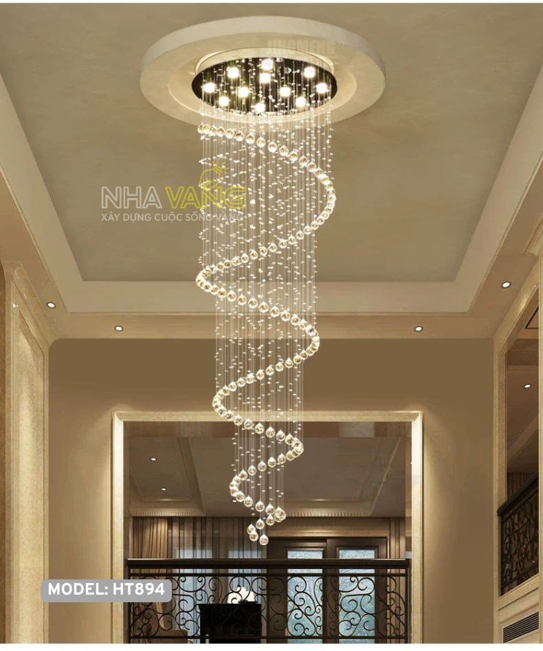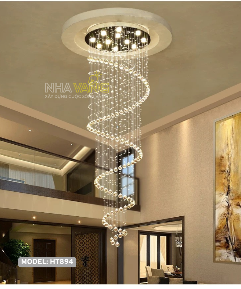 Khác biệt với những mẫu đèn chùm truyền thống, 𝐇𝐓-𝟖𝟗𝟒 sở hữu cấu trúc xoắn ốc mềm mại, uốn lượn như một dòng thác ánh sáng đang đổ xuống từ trần nhà. Từng viên pha lê cao cấp, trong suốt như sương mai, được kết nối tỉ mỉ và khéo léo, tạo nên một tổng thể hài hòa, lấp lánh và sống động.