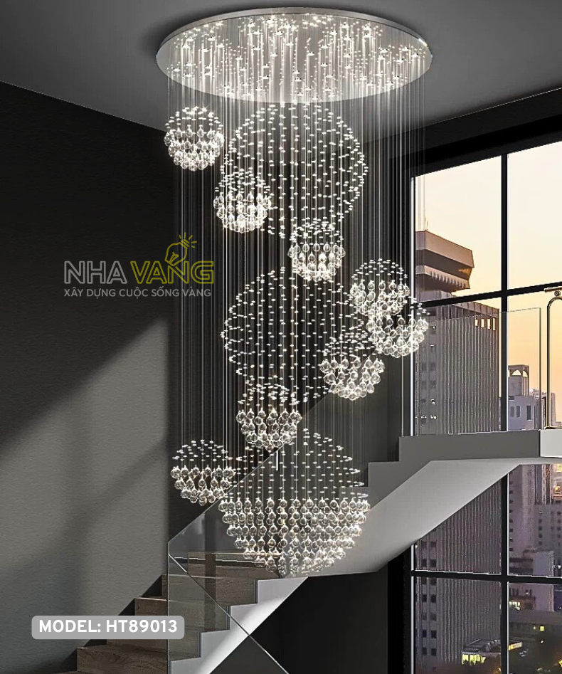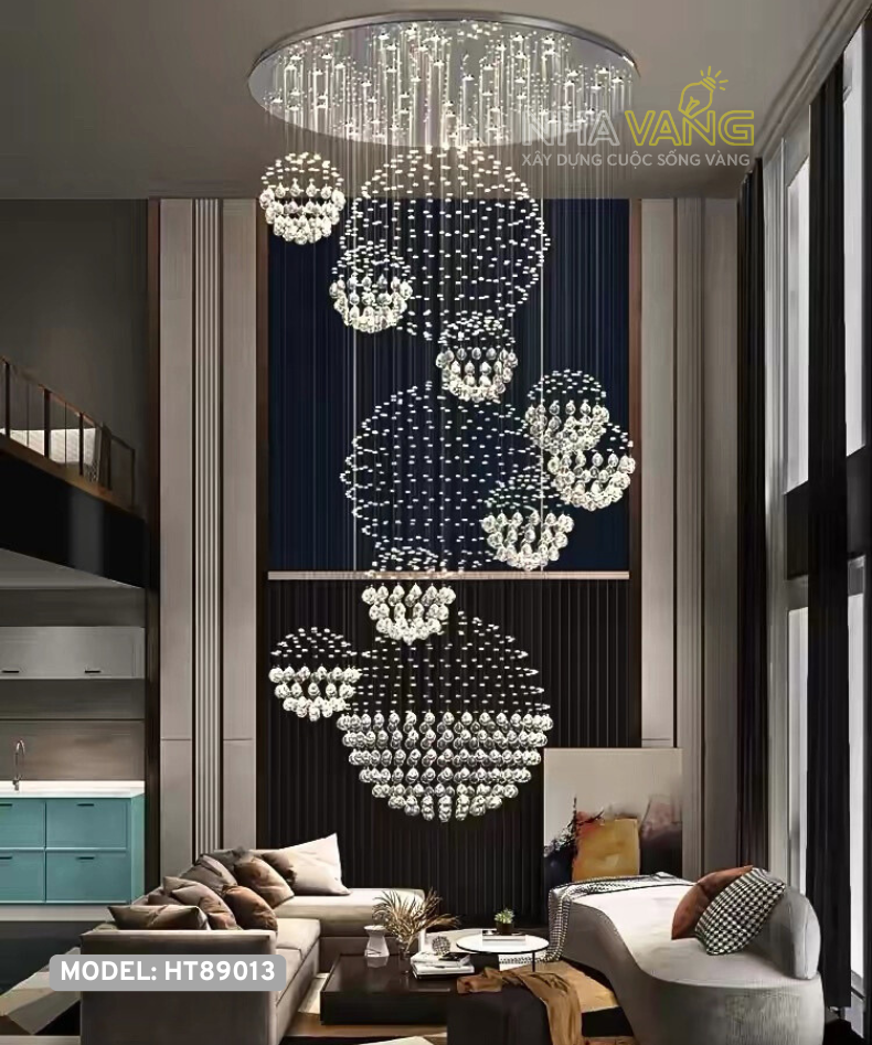 Mẫu đèn HT-89013 này được tạo hình như những khối ánh sáng lơ lửng, rơi theo chiều cao trần, tạo cảm giác chuyển động – chiều sâu – sự tinh xảo mà đèn đại trà không thể mang lại. Mỗi cụm pha lê là một điểm nhấn, khi kết hợp lại tạo nên tổng thể sang trọng, hiện đại và đầy nghệ thuật.
