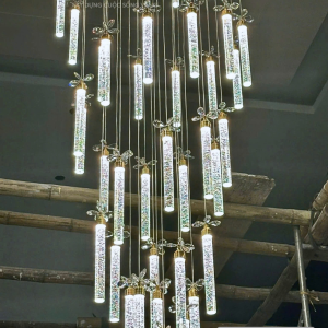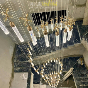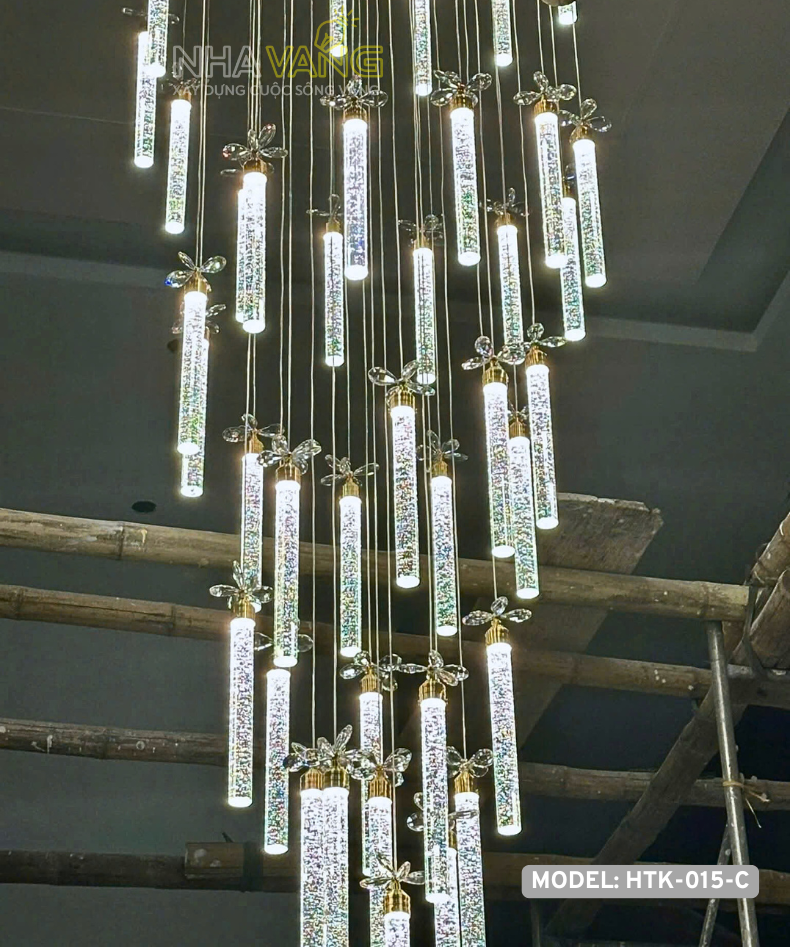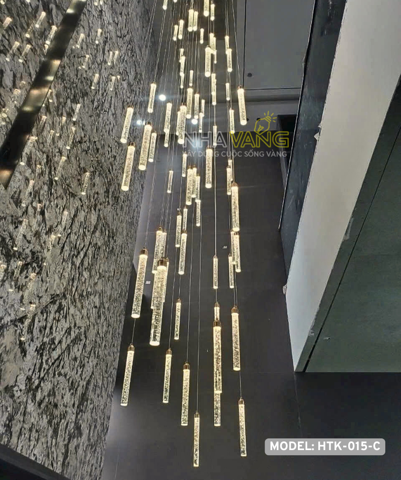 Sản phẩm đèn thả thông tầng này là sự kết hợp của nhiều bóng led lại với nhau tạo thành mẫu đèn hoàn chỉnh. Mỗi một bóng ống thuỷ tinh là một nguồn sáng, cùng với nguồn sáng hắt từ LED khung đèn, tuỳ vào diện tích không gian và ngân sách của gia chủ để thiết kế mẫu đèn phù hợp.