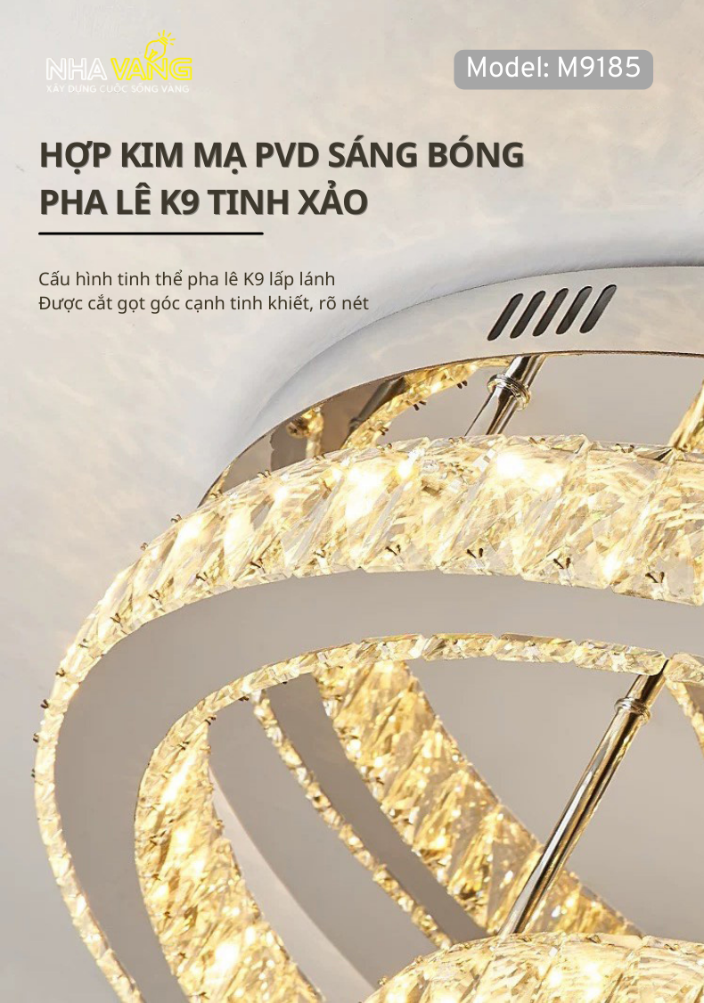 𝐌-𝟗𝟏𝟖𝟓 với thiết kế tinh tế, dây thả cùng dáng đèn vòng tạo cảm giác mềm mại và hài hòa với không gian kiến trúc của ngôi nhà bạn, tích hợp đèn LED xung quanh tạo hiệu ứng khúc xạ êm dịu, sang trọng không gây chói lóa mắt.
