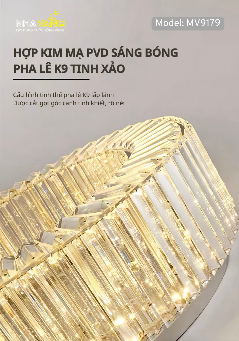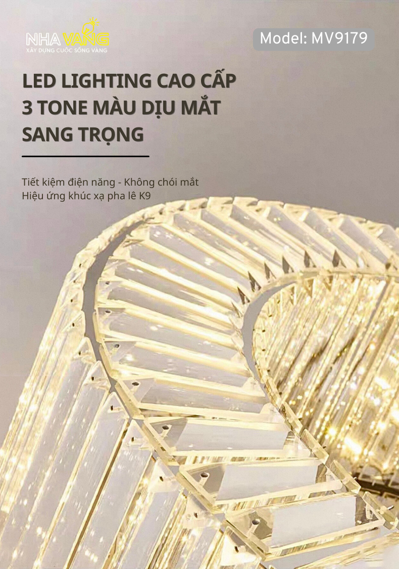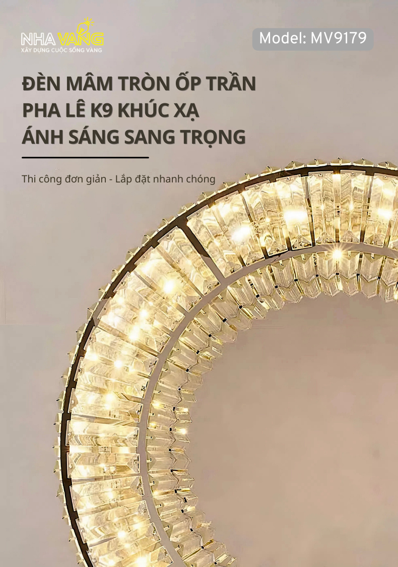 𝐌𝐕-𝟗𝟏𝟕𝟗 với thiết kế dạng tròn đơn giản tạo hiệu ứng ánh sáng đa chiều lung linh. Mâm kim loại mạ sáng bóng tích hợp LED siêu sáng , đảm bảo độ bền vượt trội. Pha lê được cắt gọt tỉ mỉ , khéo léo mang đến vẻ đẹp hài hoà và nổi bật
