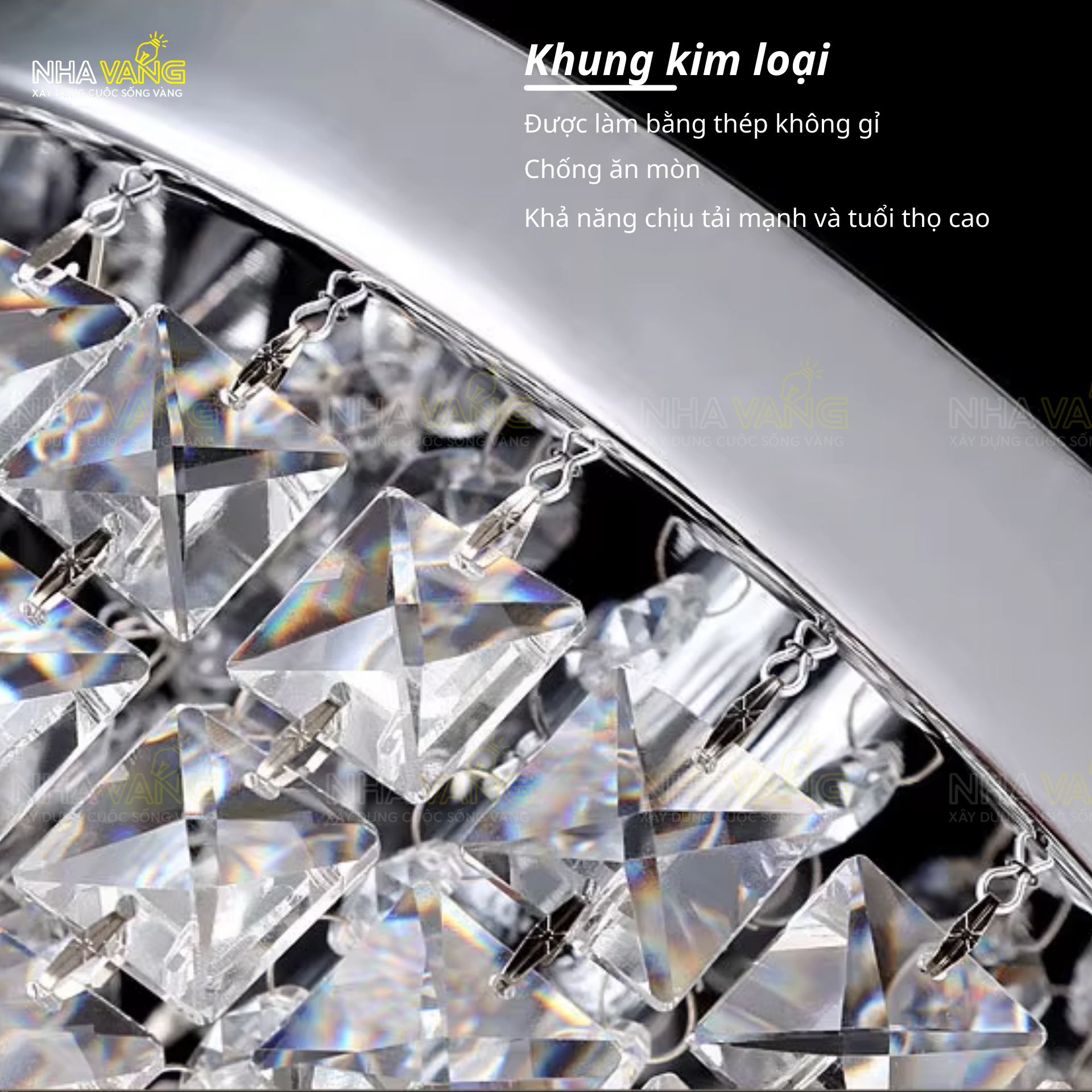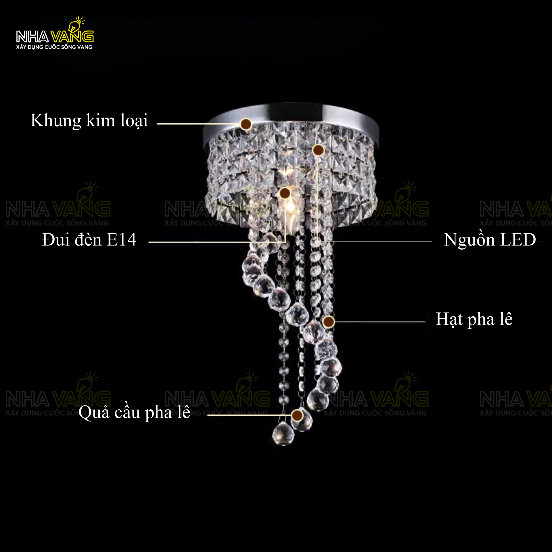 -Chất liệu: Khung kim loại, pha lê