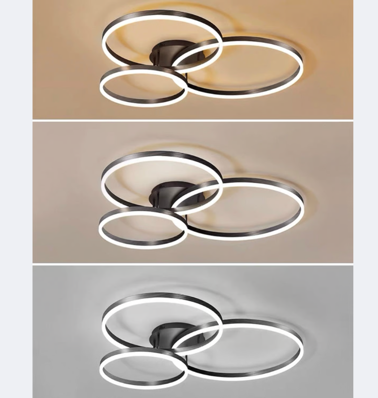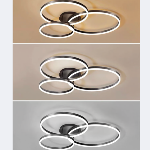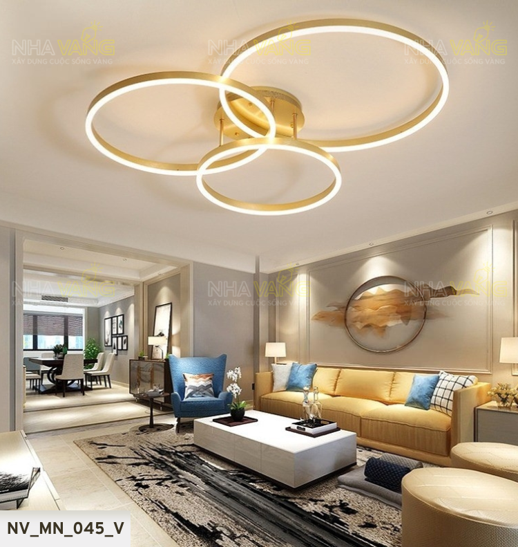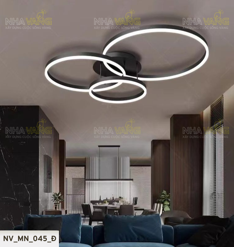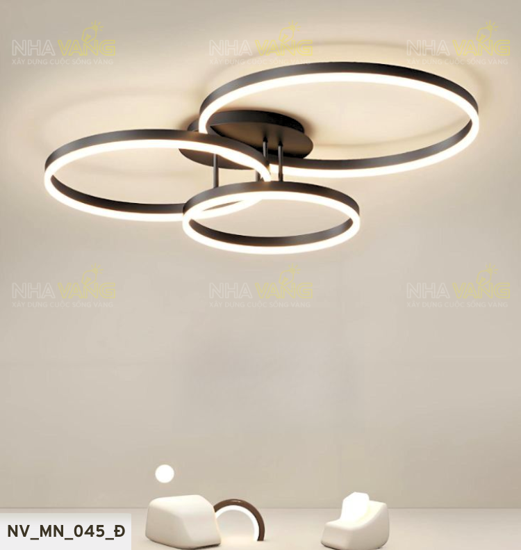 Ba vòng sáng tròn đan xen tạo cảm giác chuyển động mềm mại, giúp trần nhà trở nên cao thoáng và có chiều sâu hơn.